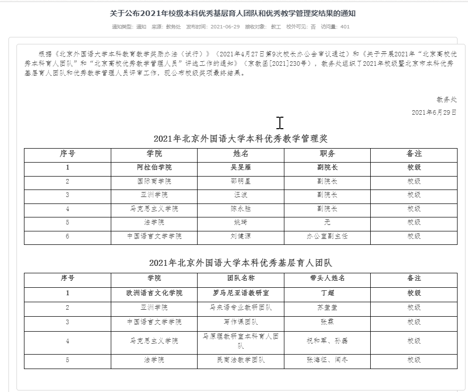 為深入貫徹落實(shí)習(xí)近平總書記關(guān)于教育和人才工作的重要論述,根據(jù)《北京外國語大學(xué)本科教育教學(xué)獎(jiǎng)勵(lì)辦法(試行)》(2021年4月27日第9次校長辦公會審議通過)和《關(guān)于開展2021年“北京高校優(yōu)秀本科育人團(tuán)隊(duì)”和“北京高校優(yōu)秀教學(xué)管理人員”評選工作的通知》(京教函[2021]230號),教務(wù)處組織了2021年校級暨北京市本科優(yōu)秀基層育人團(tuán)隊(duì)評審工作,我院原理教研室獲2021年北京外國語大學(xué)本科優(yōu)秀基層育人團(tuán)隊(duì)。