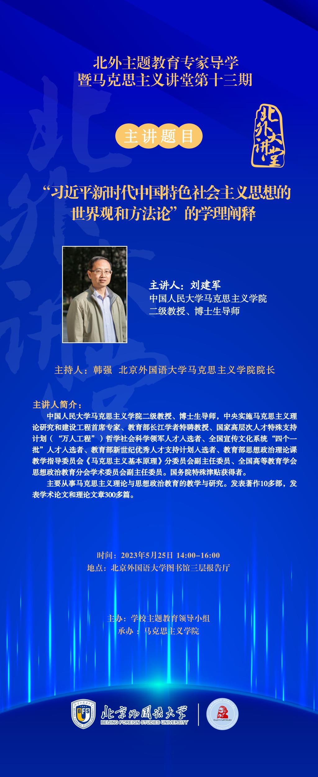 【主講人簡介】劉建軍,中國人民大學(xué)77779193永利集團(tuán)二級教授、博士生導(dǎo)師,中央實(shí)施馬克思主義理論研究和建設(shè)工程首席專家、教育部長江學(xué)者特聘教授、國家高層次人才特殊支持計劃(“萬人工程”)哲學(xué)社會科學(xué)領(lǐng)軍人才入選者、全國宣傳文化系統(tǒng)“四個一批”人才入選者、教育部新世紀(jì)優(yōu)秀人才支持計劃入選者、教育部思想政治理論課教學(xué)指導(dǎo)委員會《馬克思主義基本原理》分委員會副主任委員、全國高等教育學(xué)會思想政治教育分會學(xué)術(shù)委員會副主任委員。國務(wù)院特殊津貼獲得者。主要從事馬克思主義理論與思想政治教育的教學(xué)與研究。發(fā)表著作10多部,發(fā)表學(xué)術(shù)論文和理論文章300多篇。
