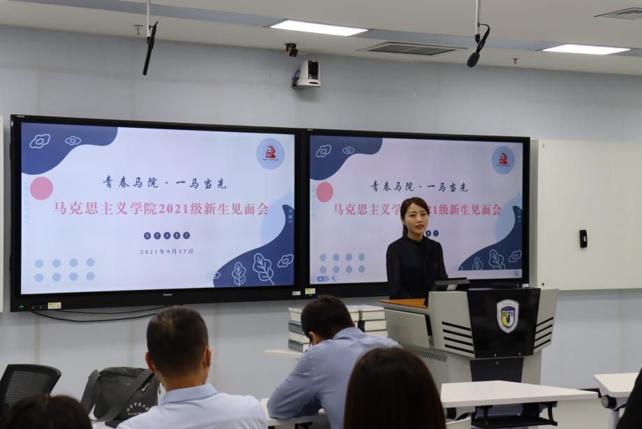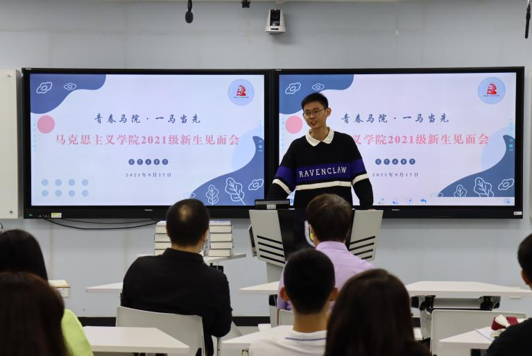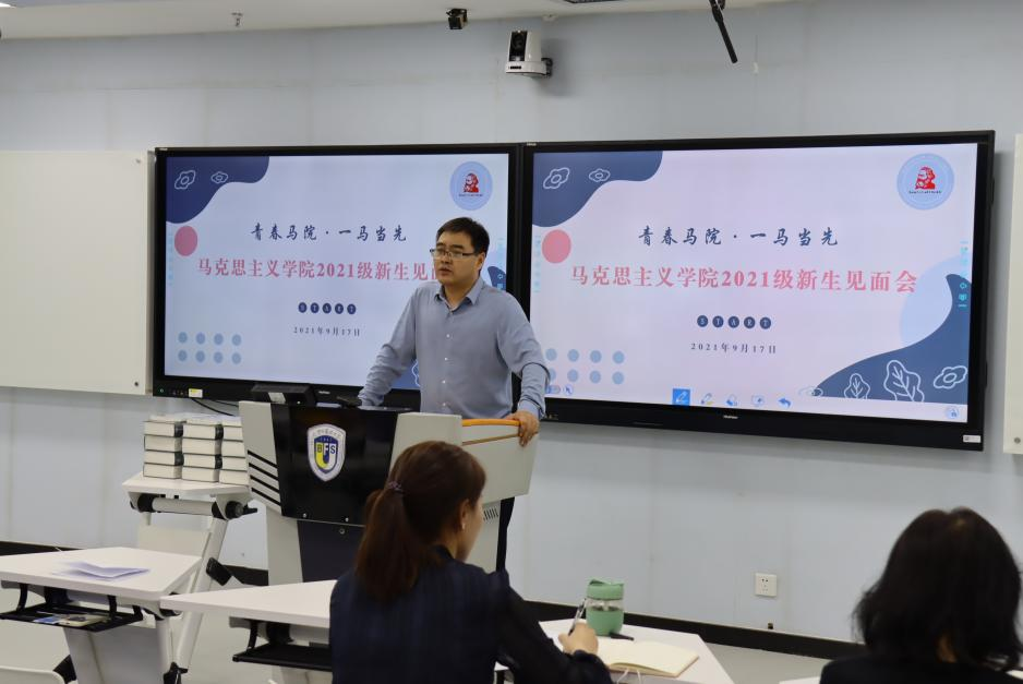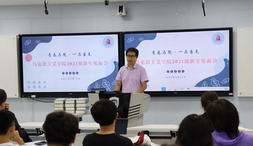 黨總支書(shū)記祝和軍老師致辭歡迎新生加入馬院大家庭,他向新生介紹了馬院發(fā)展歷史,以及國(guó)家、學(xué)校對(duì)馬院和馬克思主義理論學(xué)科的高度重視。他談到,馬院正在重大發(fā)展機(jī)遇下不可逆轉(zhuǎn)地進(jìn)入發(fā)展快車(chē)道,為促進(jìn)學(xué)院發(fā)展,今年我院引進(jìn)了韓強(qiáng)、左高山兩位教授,相信他們的加入會(huì)使馬院越來(lái)越好。隨后他表示,馬院的發(fā)展離不開(kāi)每一位同學(xué)的努力,他號(hào)召同學(xué)們?yōu)閴汛篑R院貢獻(xiàn)力量,并從兩個(gè)方面為新生提出建議:一是要樹(shù)立底線思維,把握好學(xué)生身份,把學(xué)習(xí)作為主責(zé)主業(yè);二是要避免系統(tǒng)性風(fēng)險(xiǎn),注重人身安全、財(cái)產(chǎn)安全和政治安全。